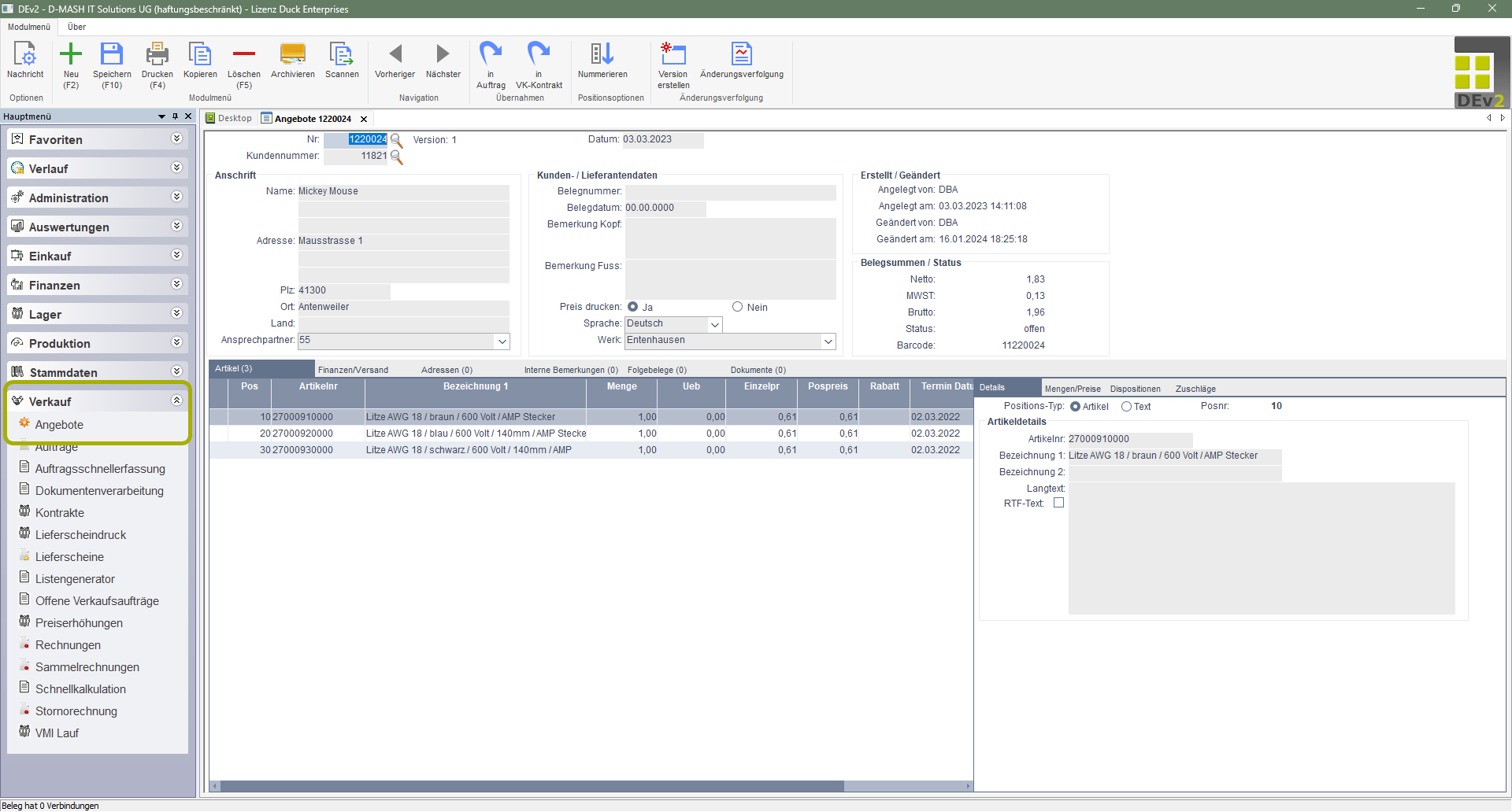 Hier finden keinerlei Buchungungen statt. Dieser Beleg dient der reinen Kommunikation mit dem Kunden und kann auch beliebig oft kopiert oder geändert werden. Erst mit Übernahme in einen Auftrag entsteht ein realisierbarer Umsatz und ein potentieller Lagerabgang.