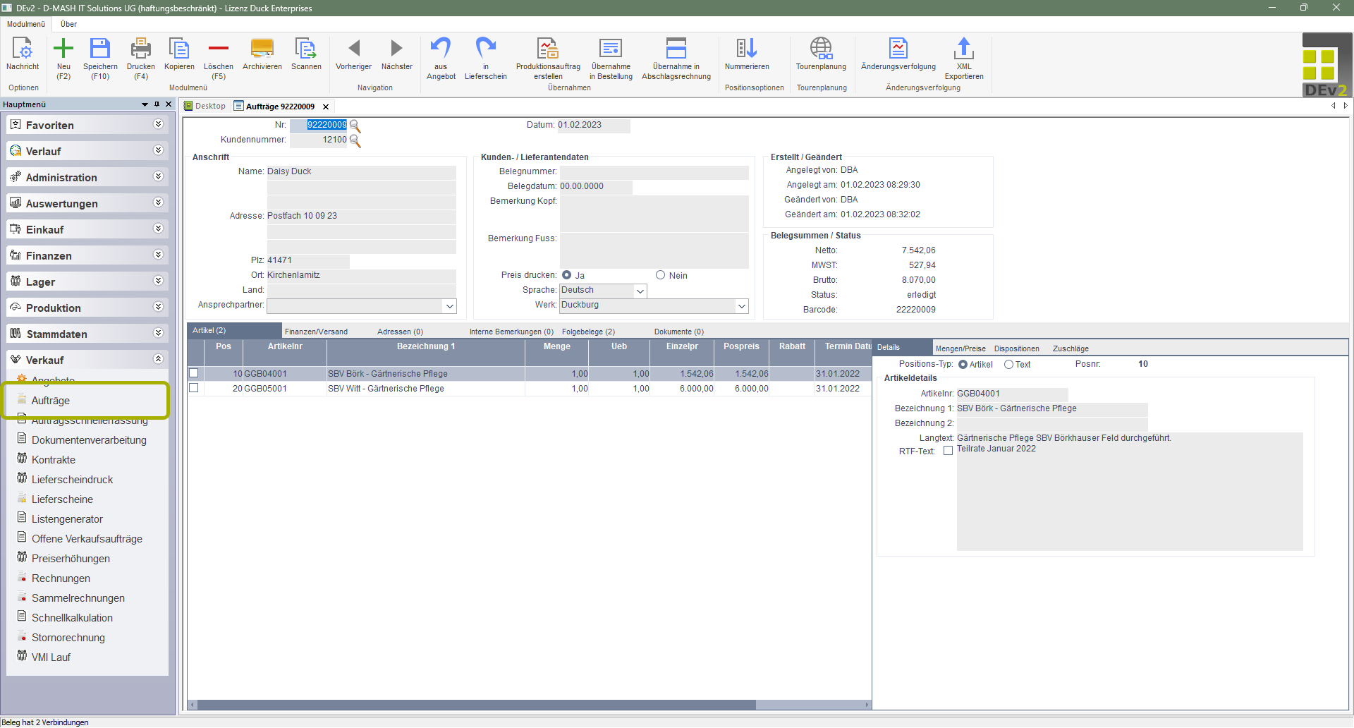 Eine praktische und schnelle Form der Anlage eines Auftrags ist die, einen bereits erfassten Auftrag zu kopieren. Wenn Kunden erneut oder regelmäßig bestellen unterscheiden sich die Bestellung nur durch das Datum, die Bestellnummer und Mengen.