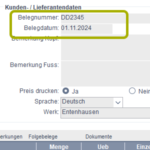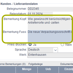 Schritt 4: Bemerkungen eintragen Die Bemerkungen "Kopf und Fuß" werden im Beleg als Kopf und Fußzeile angedruckt. Dies nur, wenn die Belegdefinition dies vorsieht, was im Standard vorgegeben ist. An der Stelle kann optional das Drucken der Preise verhindert und die Sprache des Beleges gesetzt werden. Zudem ist hier der Wechsel des Werkes möglich |