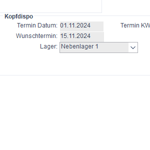 Schritt 11: Kopfdispo Es wird hier der verbindliche aber auch der Wunschtermin für den Gesamtauftrag festgelegt (daher "Kopf"dispo). Zudem kann hier eine abweichendes Lager ausgewählt werden. |