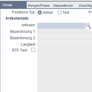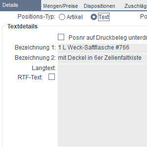 Optional: Durch den Wechsel des Positions-Typs auf Text können Positionen auch freie Texte zum Inhalt haben. Evtl. bereits übernommene Artikeltexte werden übernommen, es wird dann lediglich die Artikelnummer entfernt. Menge und Preise sind hier ohne Bedeutung. |