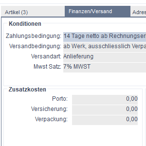 Schritt 9: Konditionen Auch die Zahlungs- und Versandbedingungen sowie die Versand wurden den Stammdaten des Kunden entnommen und eingetragen. Sie können individuell für den aktuellen Auftrag geändert werden. Sie sollten mindestens kurz geprüft werden. |