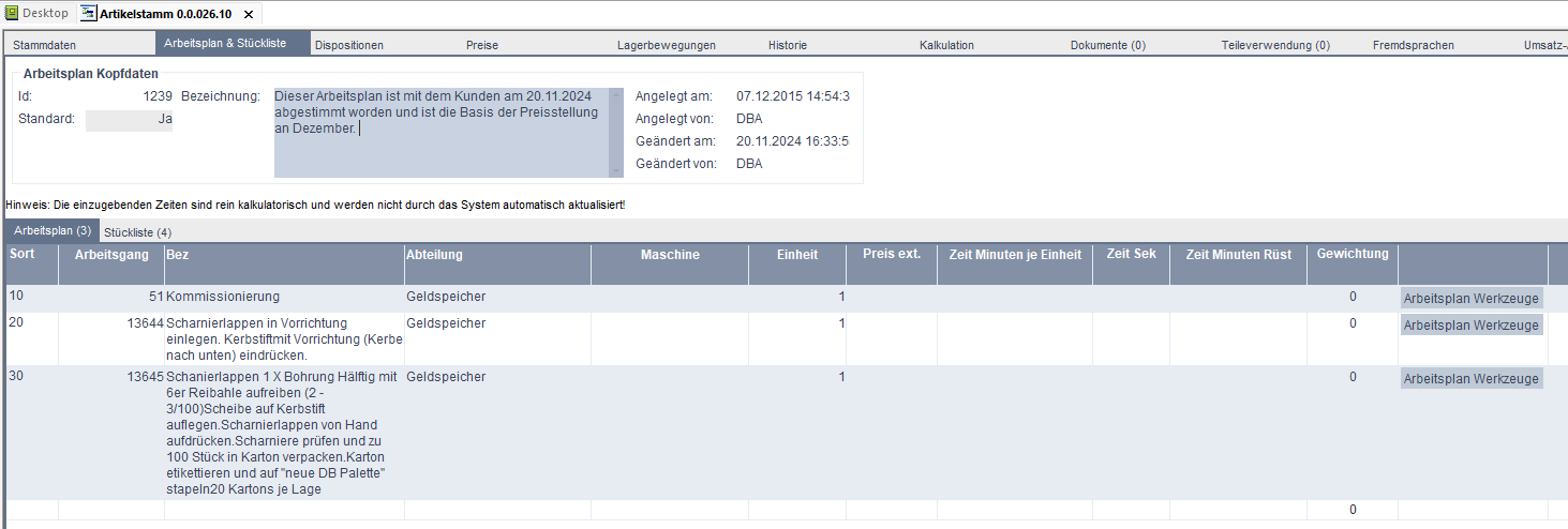 Hier werden die Arbeitsfolgen und die Stückliste, also die benötigten Artikel für einen Fertigungsartikel, bestimmt.