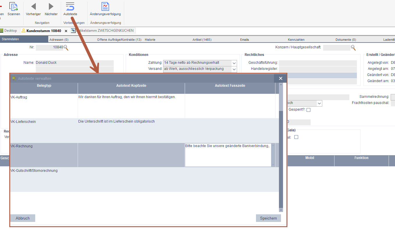 | Autotexte ermöglichen indivisduelle Kopf und Fußzeilen in Belegen. |