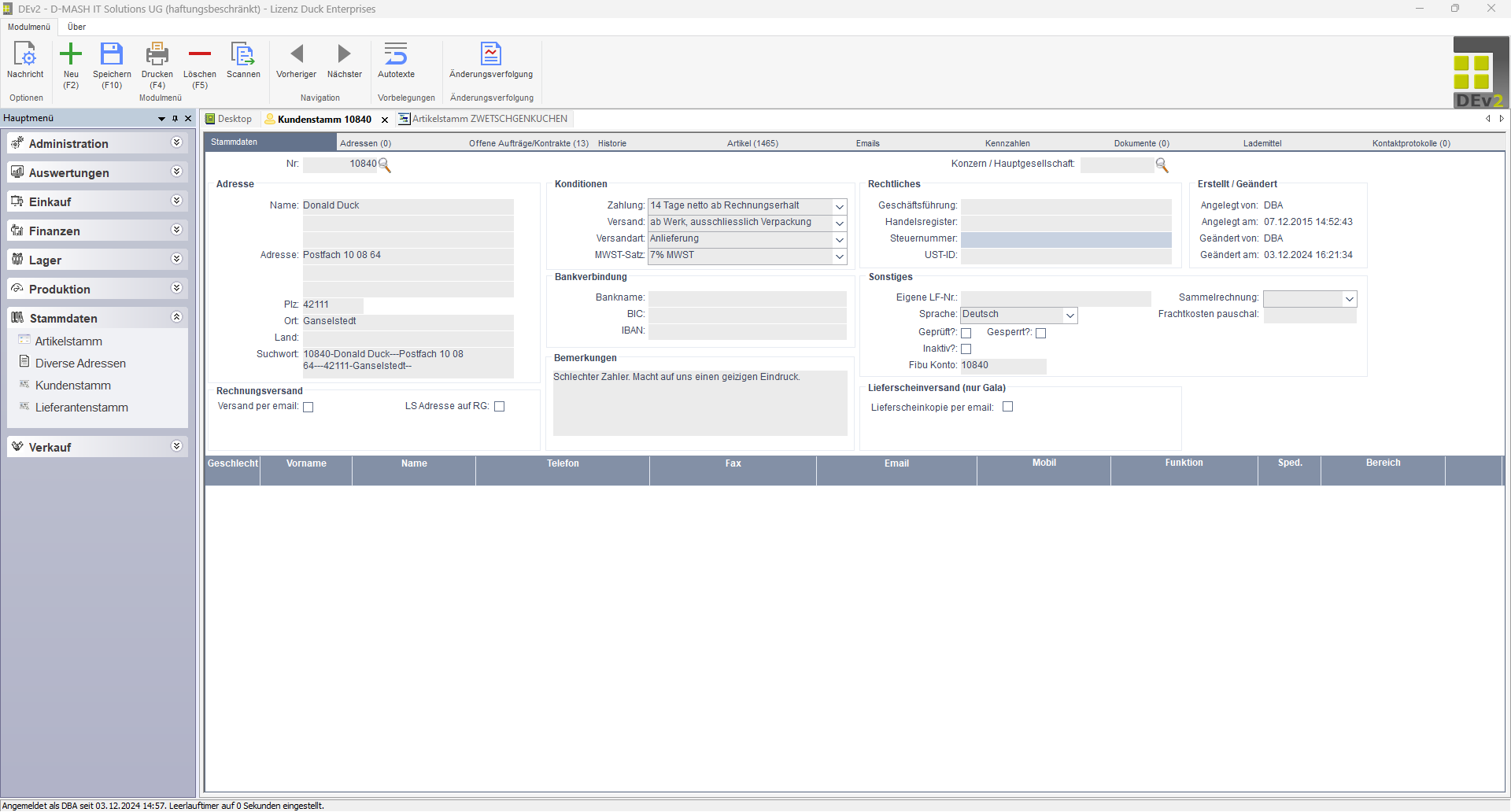 Kunden, Lieferanten, Diverse. Die Geschäftspartner unterscheiden sich kaum inhaltlich, daher sind beide Masken nahezu identisch und werden hier jeweils stellvertretend beschrieben. Einzig "Diverse Adressen" ist etwas reduzierter, da noch einige Aspekte unbedeutend sind. Doch können hier bereits auch schon Konditionen angelegt werden. In der Erwartung, dass es Kunden oder Lieferanten werden.